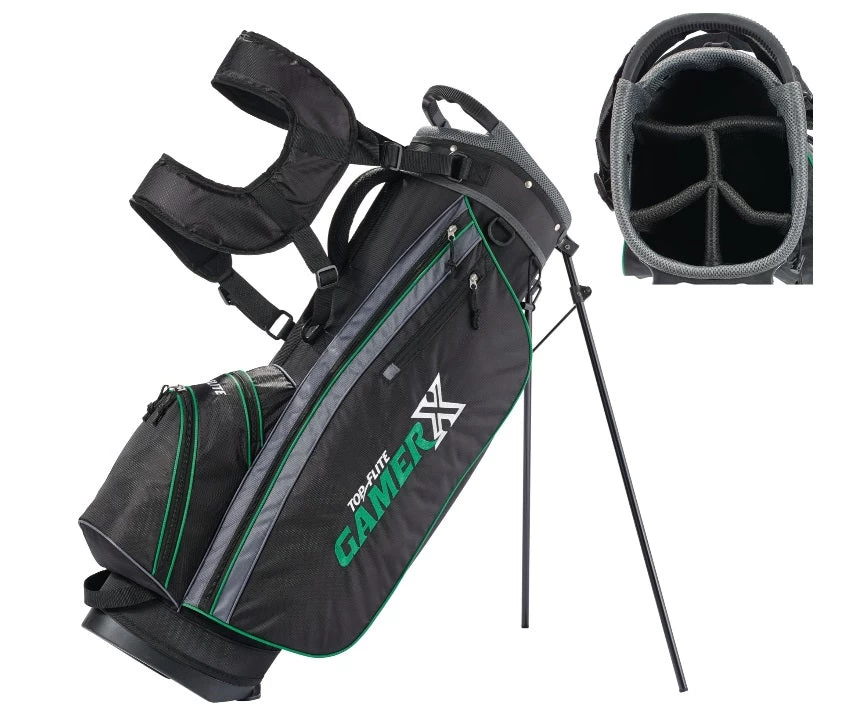 Blend uncompromising performance with enhanced forgiveness while playing the Top Flite Gamer X Complete Set. A 460cc Ti Composite Driver, low-profile 3 Wood and confidence-inspiring Hybrids ensure elevated long game performance. Wide sole, stainless steel irons feature perimeter weighting and a low CG to allow for added forgiveness and improved ball flight. An easy-to-align mallet putter simplifies the short game, while the lightweight, full-featured stand bag keeps you organized and comfortable.